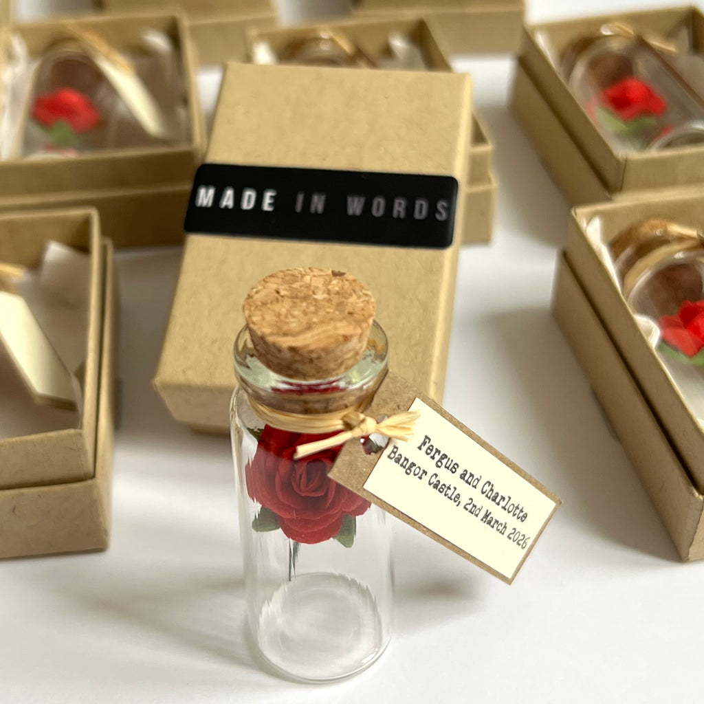 At Made In Words, we create keepsakes that speak in the smallest details. These personalised mini glass bottle favors, each holding a delicate red mulberry paper rose, are made to be treasured long after your event has ended. With this set of 50, you’ll have the perfect favors for larger weddings, parties, or corporate gatherings, ensuring every guest receives a meaningful gift.