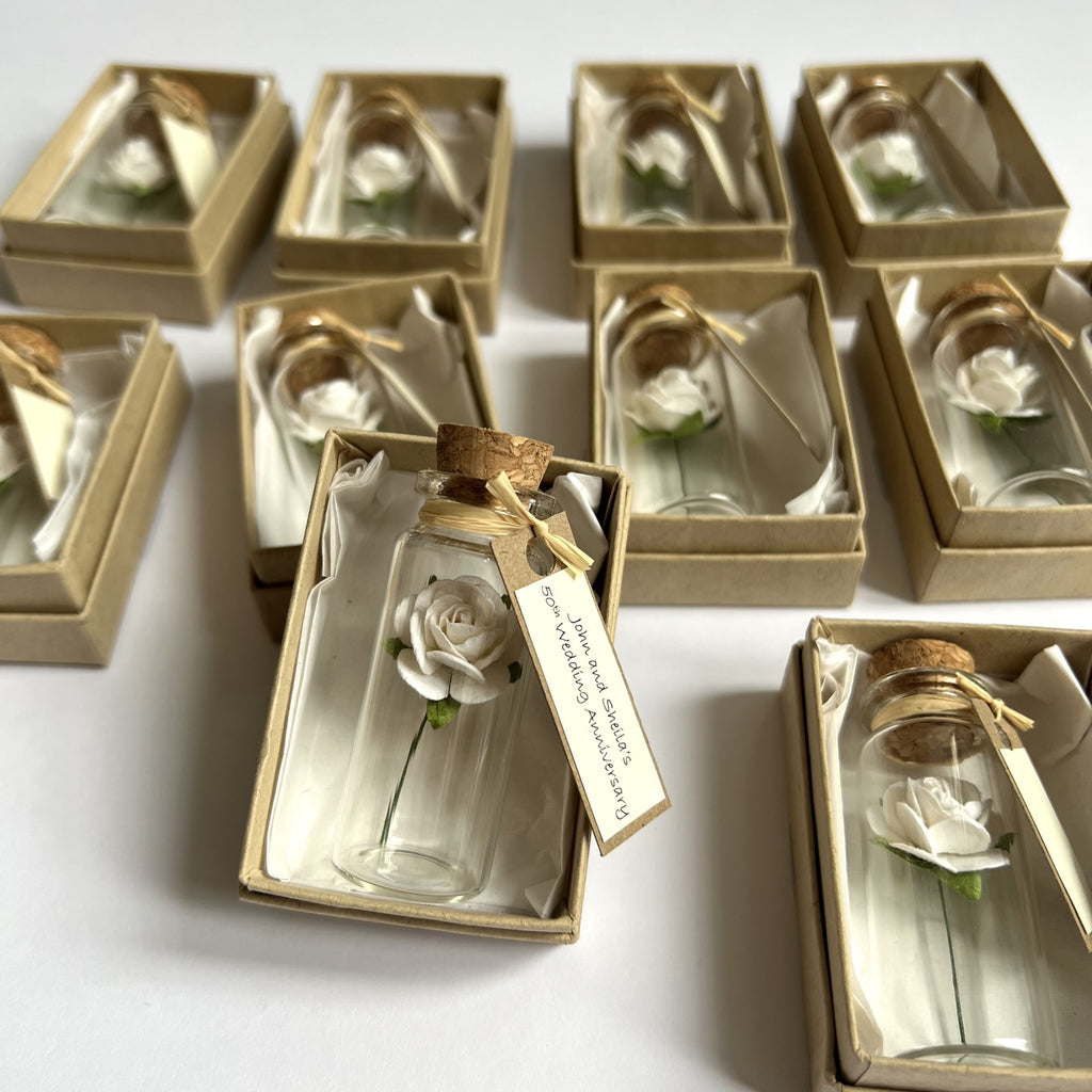 10 Personalised Handmade Cream Paper Rose Glass Bottle Favors with Custom Tags
