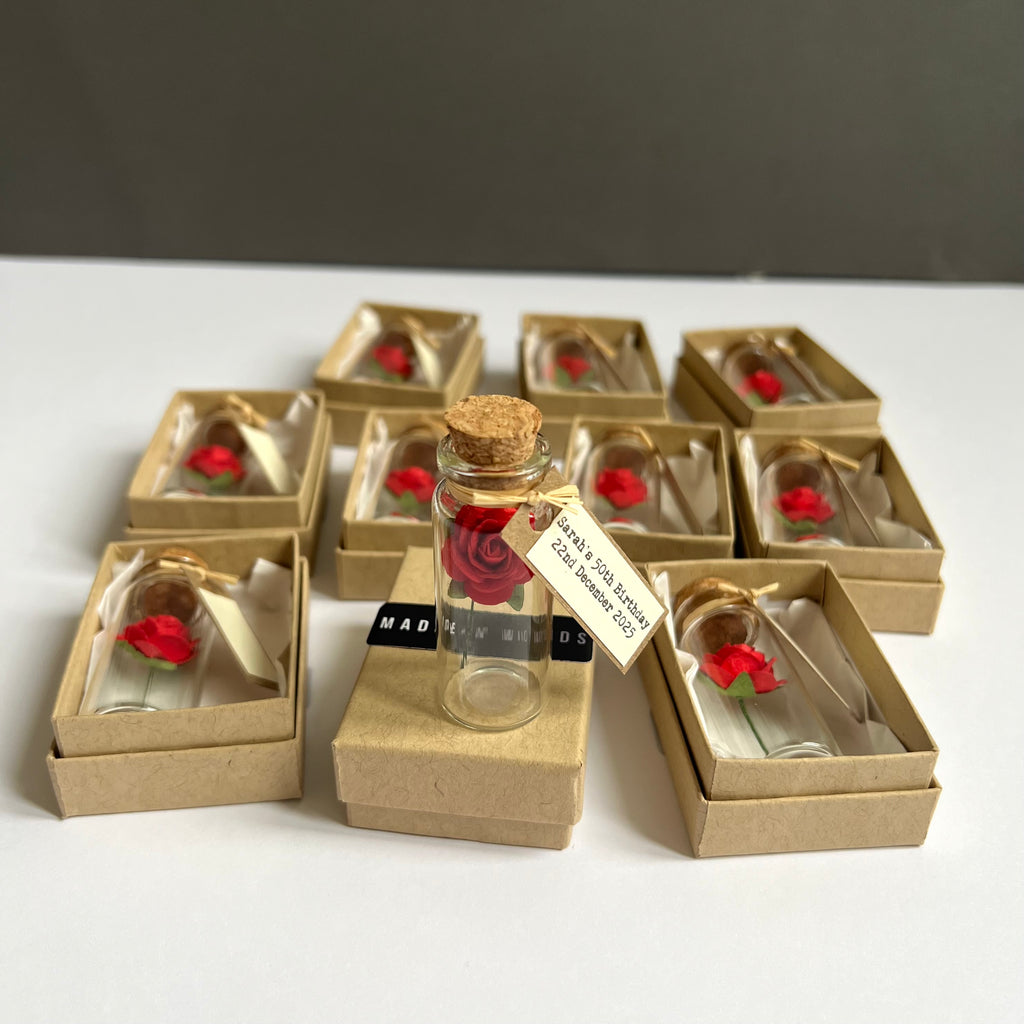 Looking for unique and memorable favors for your special event? This set includes 10 red mulberry paper roses in miniature glass bottles with corks, each finished with a personalised tag. These charming keepsakes are perfect for wedding favors, party favors, save the date gifts, or thank you tokens for your guests.